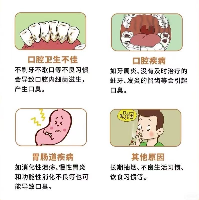 •口腔内细菌腐败发酵产生的臭味。只有从这些根源入手,问题才能迎刃而解!