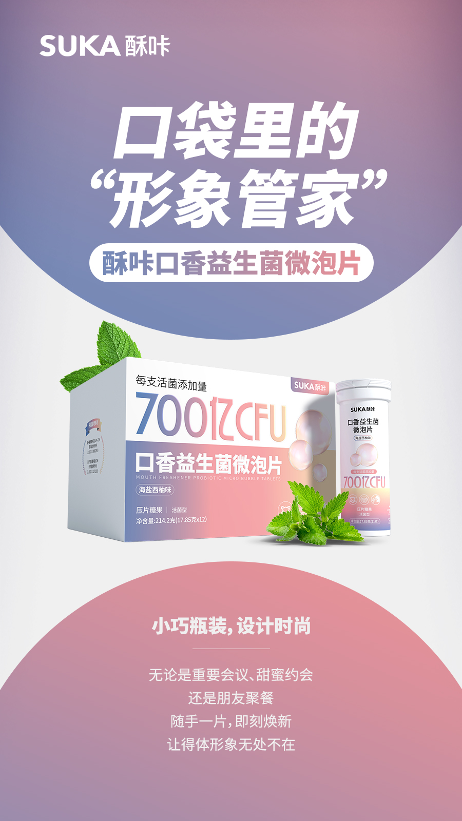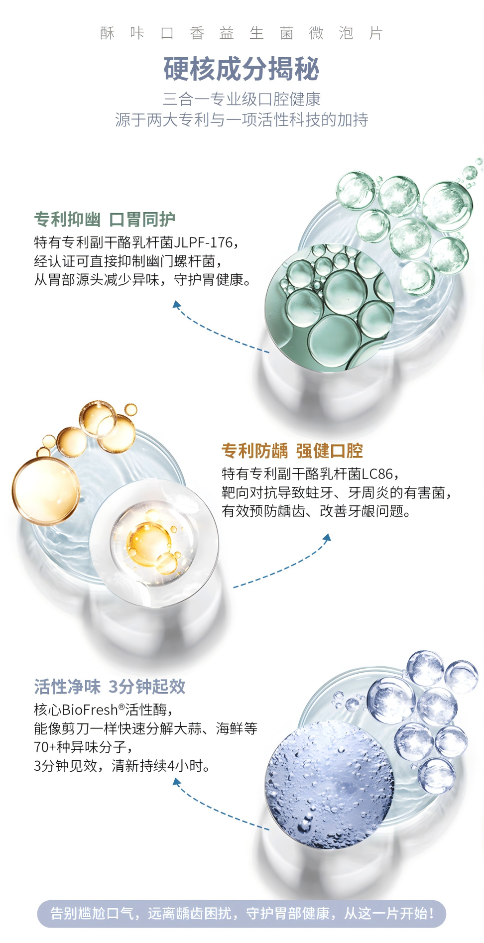 SUKA上市的新品-酥咔口香益生菌微泡片,针对口腔问题进行深挖研究,它不仅仅是一款清新口气的产品,更是一款实现“三合一专业级口腔健康”的革新之作!它的硬核实力,源于两大专利成分与一项活性科技的强力加持!